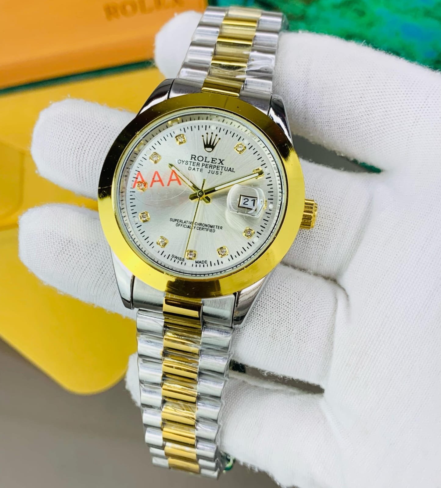 Be the first to review “Rolex Golden silver chain with silver dial and date just”